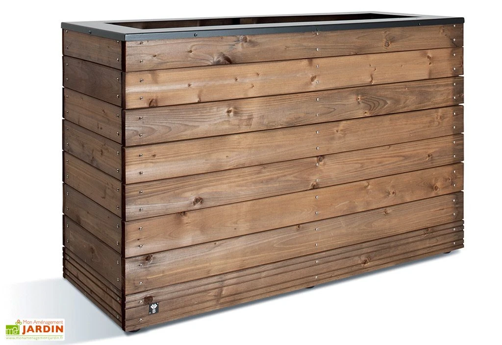 Le bac à fleurs Selekt (120x45x76) de chez Jardipolys est en bois de pin traité autoclave de classe 3. Il est teinté en brun et ne demande aucun entretien particulier de votre part. Fabriqué en France, il est également certifié PEFC, pour une utilisation du bois issu de forêts gérées durablement.