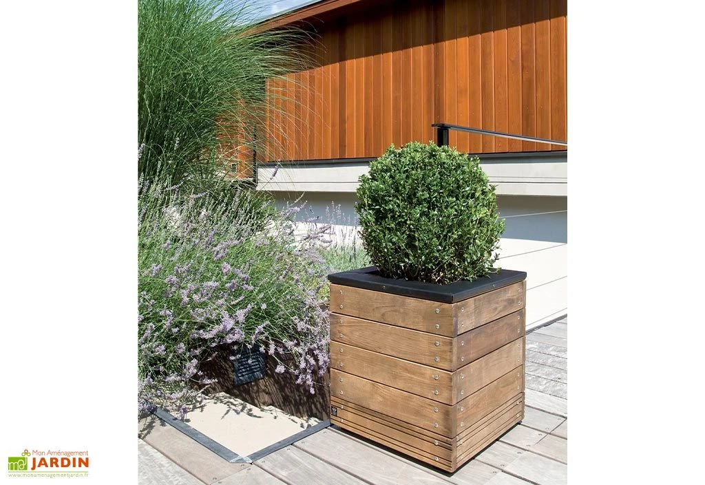 Votre bac à fleurs Selekt de chez Jardipolys est carré. Il a été fabriqué en France. Ses dimensions hors tout sont de 45 x 45 cm (longueur, largeur) pour une hauteur de 47,5 cm, ce qui lui donne des dimensions intérieures de 40,8 x 40,8 cm (longueur, largeur), pour 40 cm de hauteur. Les lames en bois présentes sur chaque face mesurent 9,5 cm de long et les 4 montants affichent des dimensions de 45 x 45 cm.