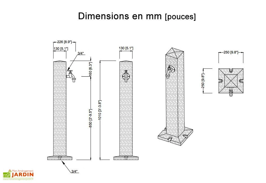 La fontaine de jardin mesure 1 m de hauteur pour 13 cm de côté. Elle est équipée d’une embase de 25 x 25 cm à fixer impérativement dans le béton grâce à 4 points d’ancrage (vis d’ancrage non incluses). Elle est livrée avec son robinet en laiton 3/4″ (19 mm), déjà monté sur la fontaine. Le raccordement 3/4″(19 mm) se situe en bas de la fontaine.