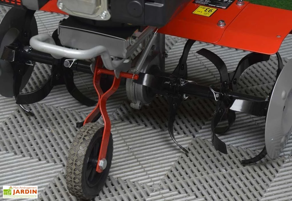 La motobineuse thermique de 139 cc dispose d’un moteur OHV 4 temps. La motobineuse possède 6 fraises pour une largeur de travail maximale de 59 cm et une profondeur de 26 cm. La motobineuse dispose d’un réservoir d’essence de 1,6 L et d’huile de 0,55 L. Avec son guidon large, ses poignées et sa roue avant, le transport de l’appareil sera facilité. Il est équipé de caches en métal pour la protection des fleurs. La garantie est de 2 ans.