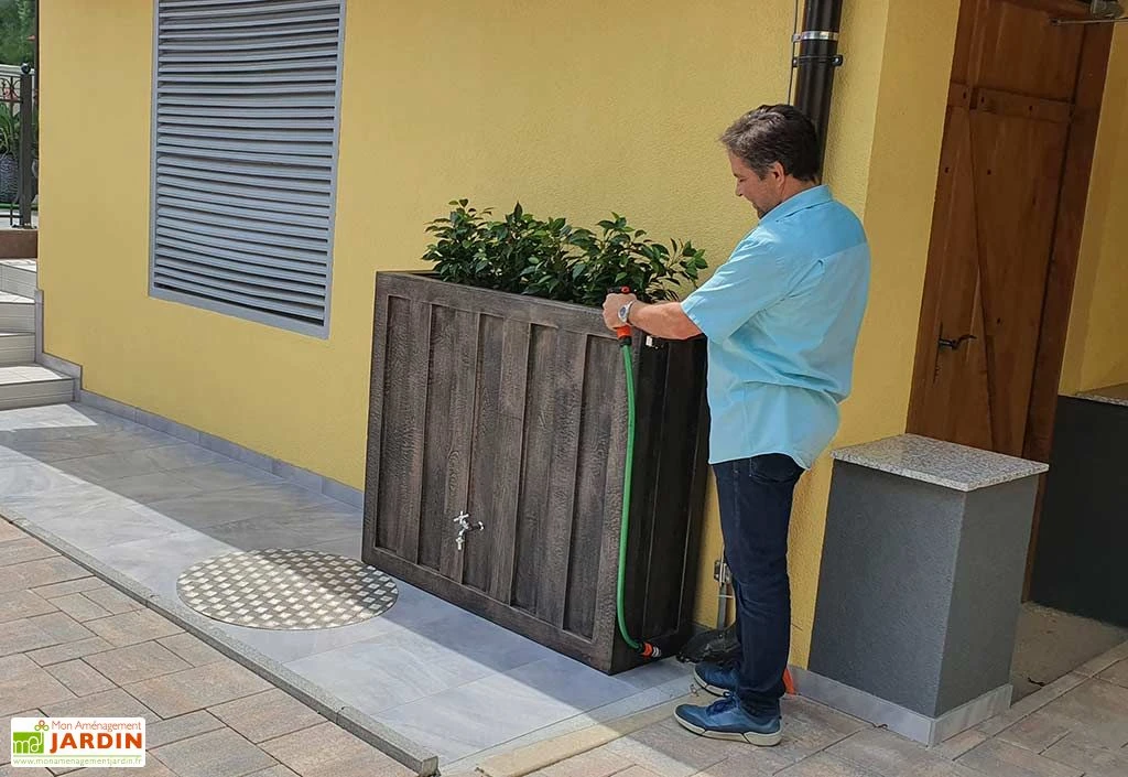 La cuve de récupération d’eau de pluie de chez Roto est en polyéthylène imitation bois. Elle est résistante aux chocs, aux variations climatiques et aux différences de températures.