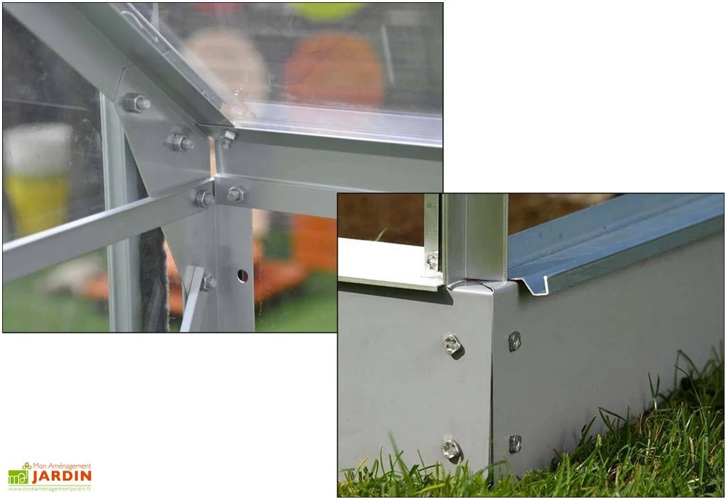 La petite serre adossée dispose d’une gouttière permettant de récupérer l’eau de pluie et d’une base en acier galvanisé de 6 cm de hauteur. Cette base vous permet d’installer la serre directement sur la terre ou sur la pelouse sans avoir à créer de dalle de béton. Le sol doit être de niveau. La serre est livrée en kit, facile à monter grâce à une notice de montage détaillée.
