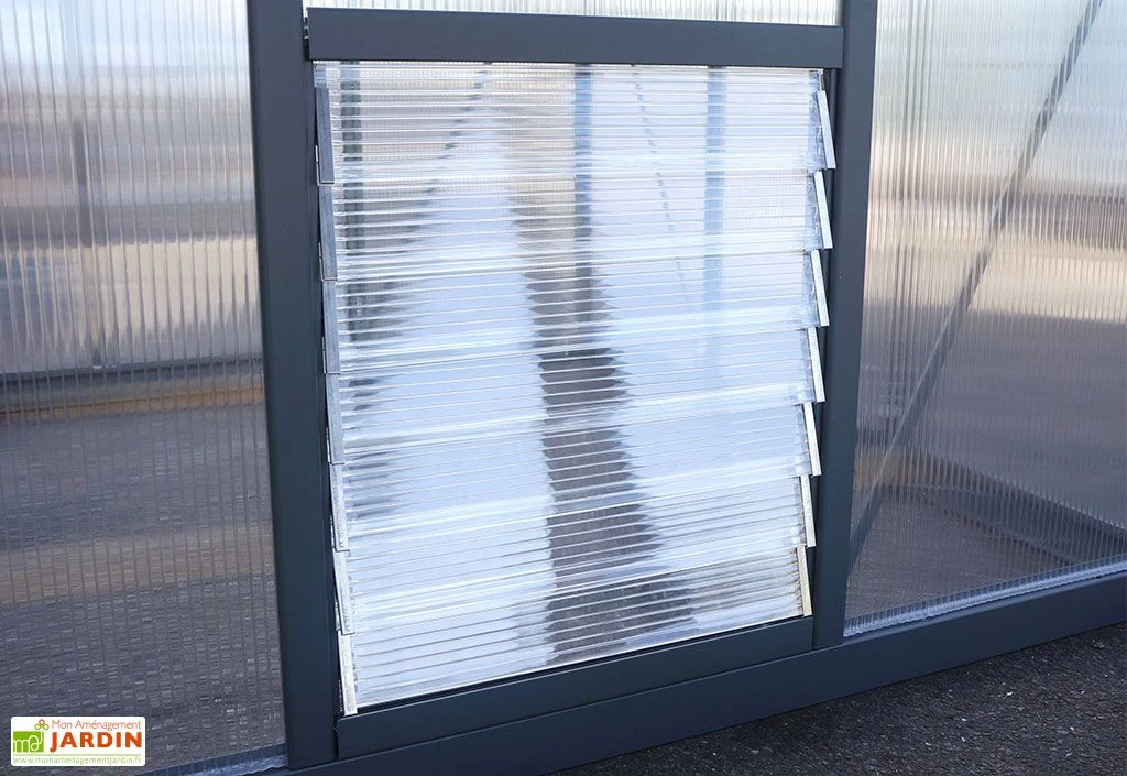 La toiture de la serre s’est vue dotée de deux fenêtres dont l’ouverture se fera automatiquement lorsque la température intérieure atteint les 12 à 15 °C. Une grille de ventilation à volets mobiles vient compléter ces ouvertures et permettra de réguler le taux d’humidité ou la température tout en assurant une bonne circulation de l’air. Le toit dispose même de gouttières de 3,2 cm de diamètre pour l’évacuation ou la récupération de l’eau de pluie.