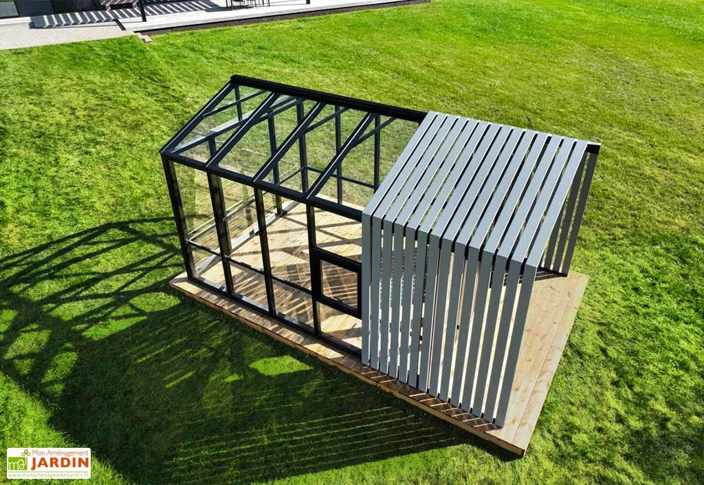 Cette serre de jardin au design original est signée Stali. Composée d’une structure en bois et de parois en verre trempé, elle est complétée par des panneaux occultants en bois, offrant intimité et ombre à l’avant de la structure.