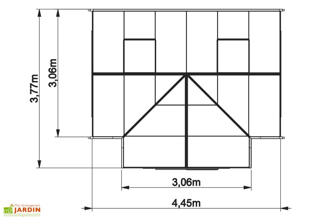 La serre de jardin mesure 3,77 m de profondeur, 4,45 m de largeur et 2,59 m de hauteur faitage. La hauteur gouttière est de 1,79 m. La serre est équipée de 2 lucarnes et d’une porte coulissante de 185,2 cm de hauteur qui offre une largeur de passage de 69 cm. Les lucarnes et la double porte permettent de créer une aération importante à l’intérieur de la serre pour réguler facilement la température.