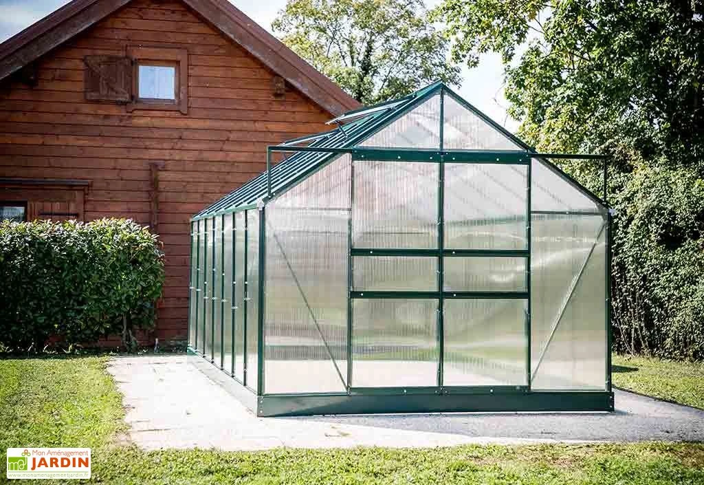 Votre serre de jardin de chez Habrita mesure 244 x 425 x 223 cm (l,l,h) pour une surface de 10,37 m². Elle est constituée d’une structure en aluminium anti-corrosion vert et de panneaux de polycarbonate 6 mm anti-UV.