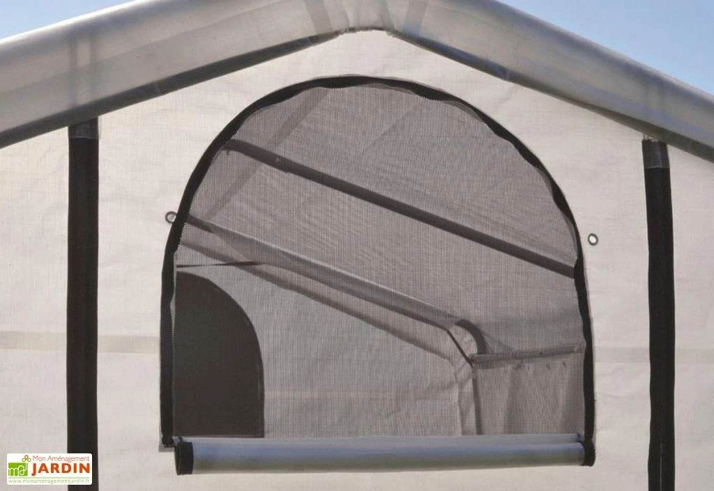 Pour une excellente ventilation à l’intérieur de la serre, celle-ci dispose de 2 fenêtres et de 2 aérations. Les deux fenêtres permettent de limiter la condensation à l’intérieur de l’abri. La première se situe au-dessus de la porte et la seconde sur la paroi du fond. Les parois latérales se transforment en aération. Elles s’enroulent et se fixent simplement et permettent de contrôler la température sous la serre.