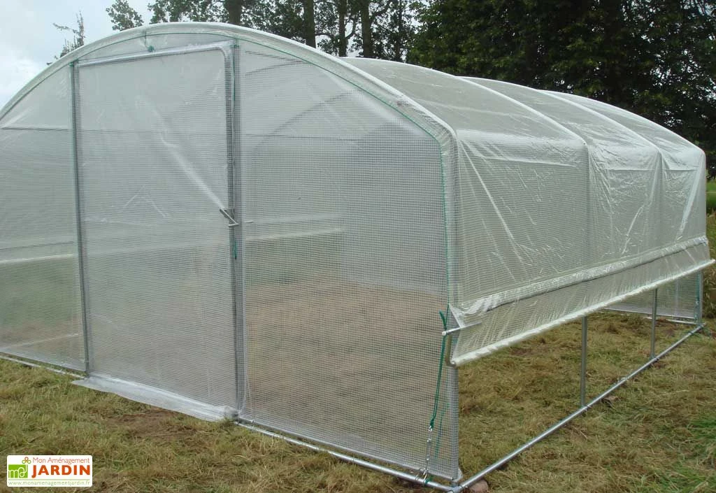 Cette serre de la marque Tonneau est fabriquée en polyéthylène 200 microns résistant aux UV et complété d’ourlets avec cordes, le tout reposant sur une armature en acier galvanisé de 30 mm. La hauteur des pieds droits est de 1,5 m. Elle est équipée d’une porte pivotante de 1,35 m de large en façade et une seconde porte est disponible en option pour l’autre extrémité.