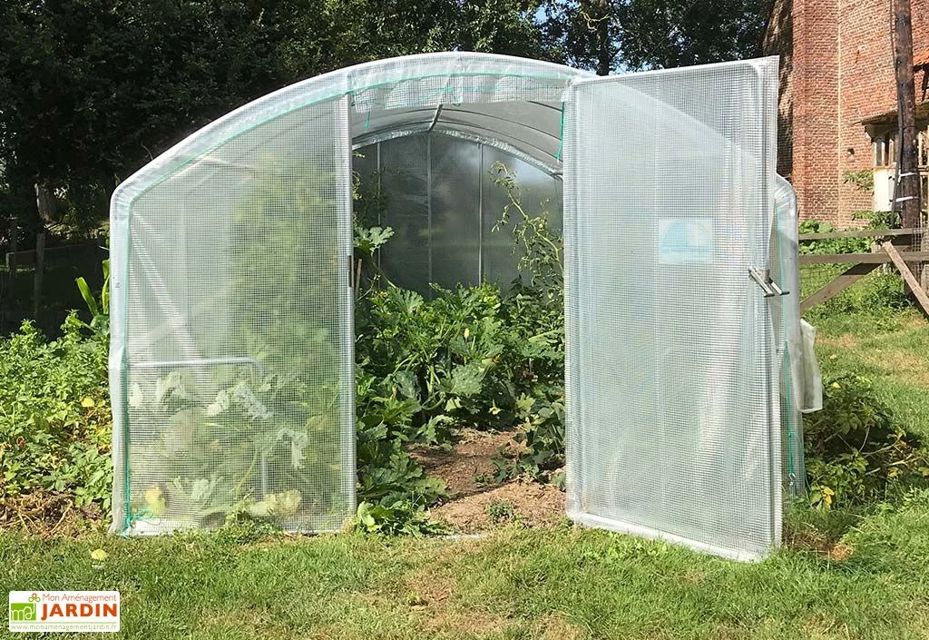 La serre de jardin bénéficie de pieds droits, ce qui permet à ses côtés de disposer d’une hauteur de 1,50 m, facilitant le jardinage. La façade avant est équipée d’une porte pivotante d’1 m de largeur.