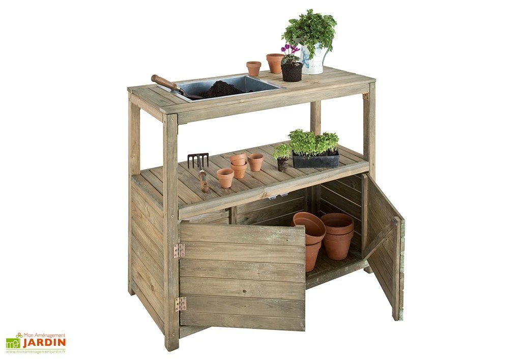 La table est en pin traité autoclave de classe 3, afin de résister à l’humidité, à la moisissure, aux insectes et aux intempéries. Ce bois certifié FSC, est issu de forêts gérées de manière responsable et durable, il ne vous demandera aucun traitement supplémentaire. La table est équipée d’un bac en acier galvanisé de 40 x 30 x 8 cm (l,l,h) qui vous aidera pour votre rempotage. Il ne rouillera pas et ne subira pas de corrosion.