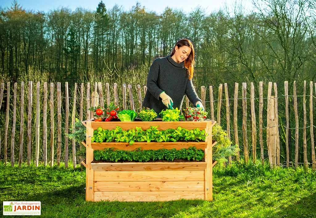 Cette tour de culture en bois de la marque Westmann permet de cultiver des légumes, des fruits ou des plantes aromatiques à la verticale, ce qui est idéal pour économiser de l’espace. Pensé pour les petits jardins, les cours ou les balcons, ce potager surélevé compte ainsi trois étages de 91 cm de long sur 124 cm de large et que vous pourrez légèrement agrandir grâce à des lamelles latérales inclinables. Ses 73 cm de haut vous permettront par ailleurs de jardiner sans avoir à vous baisser.